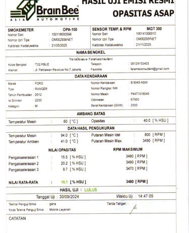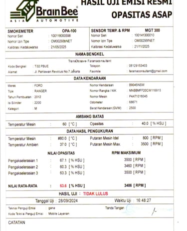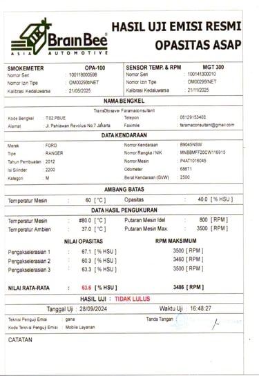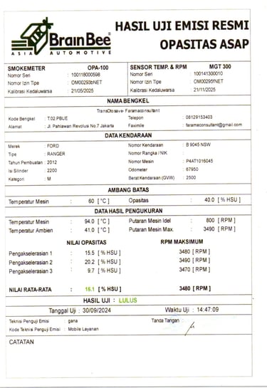 Hasil Test EMisi Gas Buang Kendaraan ford ranger 2012